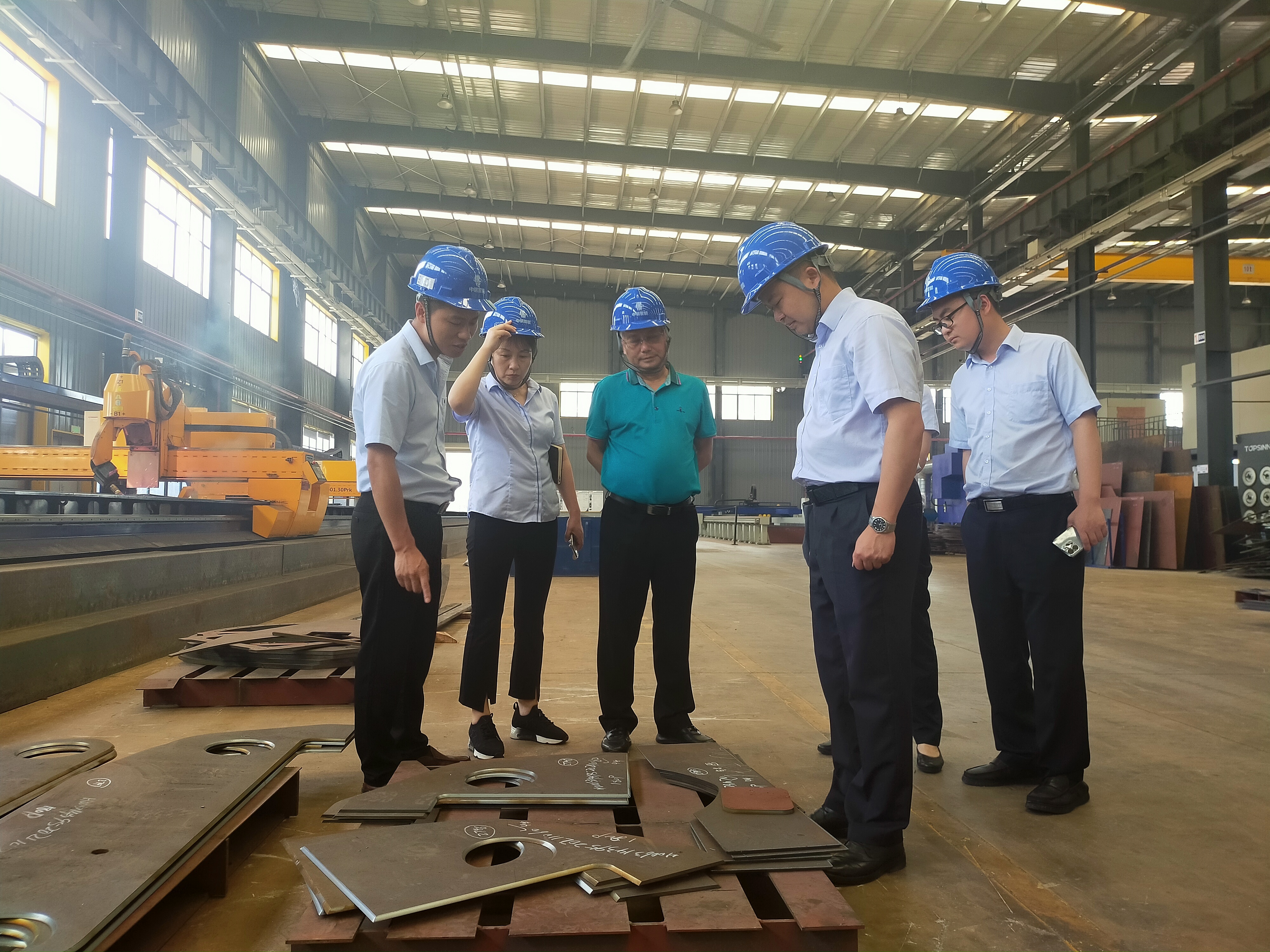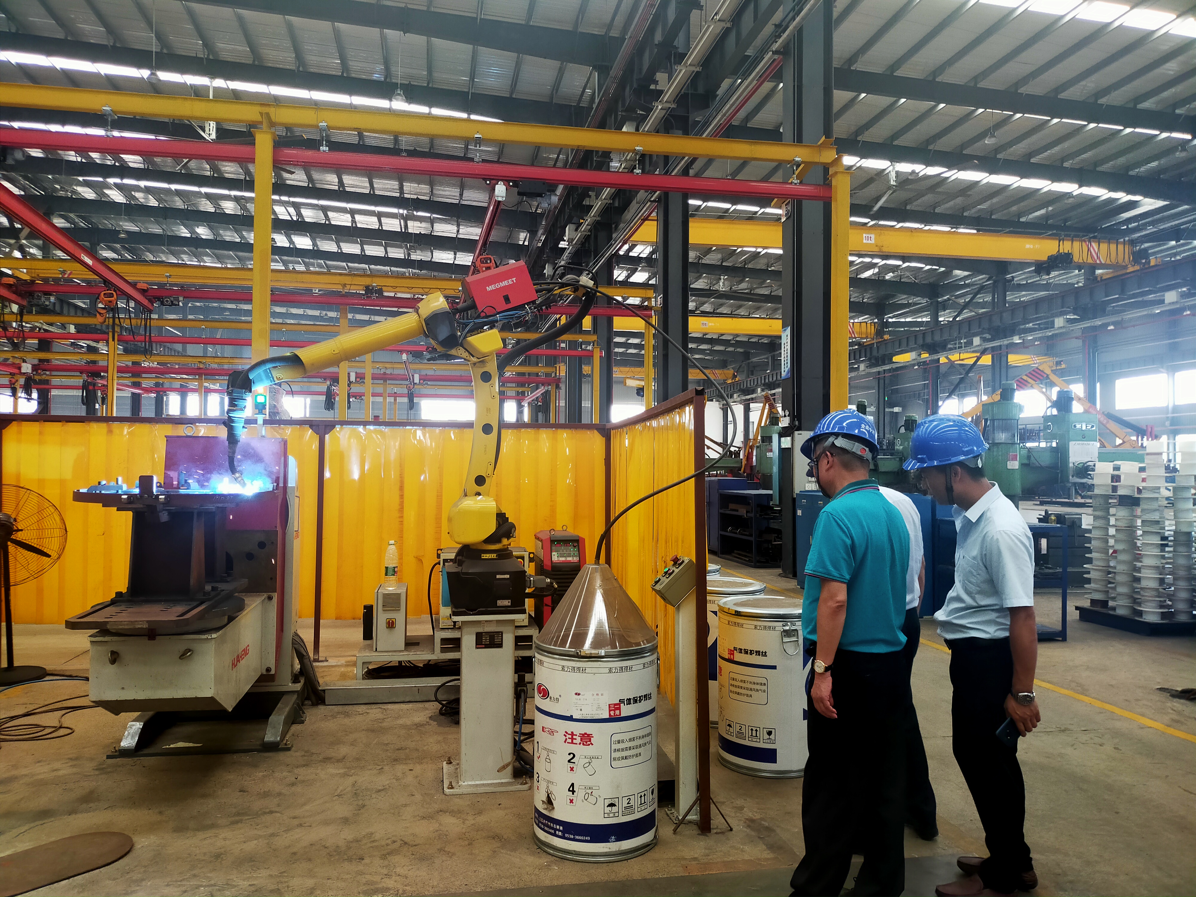 张行长一行在董事长的带领下,首先参观了生产车间门口的宣传栏,基本了解了中钢智能的企业文化,随后进入中钢智能生产车间,董事长岳俊峰边走边向张行长一行介绍目前中钢智能的生产经营情况、厂区规划和最终产品等等。在参观车间过程中,董事长重点介绍了正在运作的一台加工设备——焊接机器人,董事长向张行长介绍到,“中钢智能大约有20余台这样的焊接机器人,这些焊接机器人能够实现起重机臂头、臂尾零部件的焊接。”