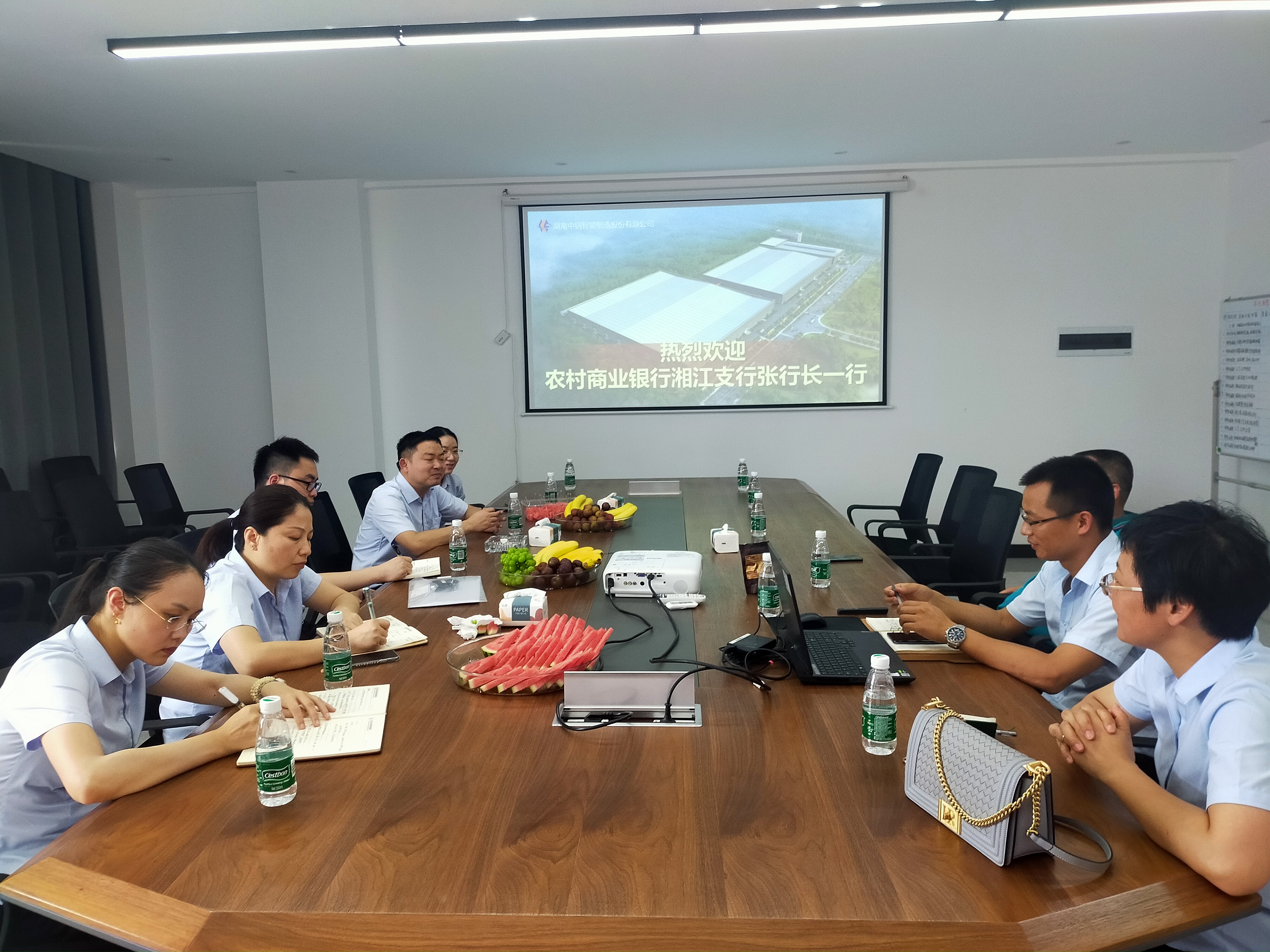 近日,农村商业银行湘江支行张行长一行莅临湖南中钢智能装备有限公司考察调研,湖南中钢集团董事长岳俊峰、湖南中钢智能装备有限公司副总经理黎练热情接待。